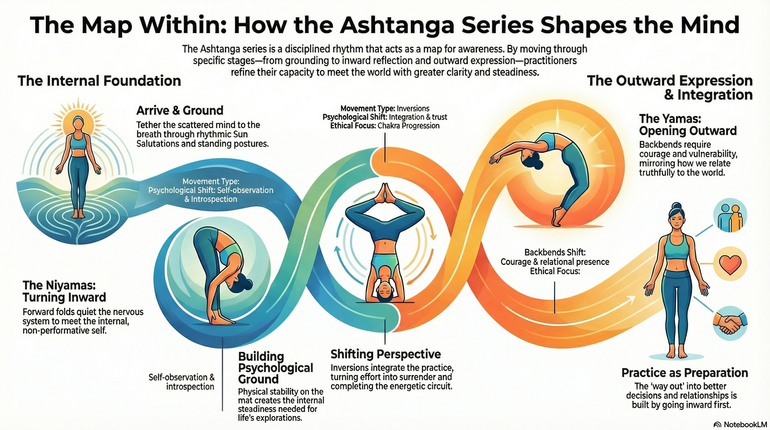 Across the sequence, there is a natural movement—grounding, turning inward, opening outward, and then integrating it all. Many describe this as moving through the energetic system of the body, a kind of rising and circulating awareness often linked to the chakras.